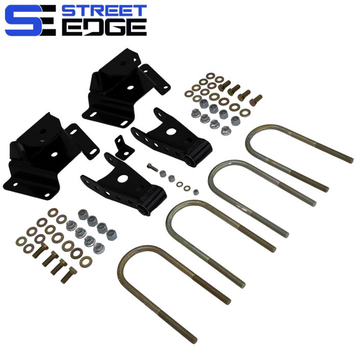 Street Edge Shackle and Hanger Kits combine to lower the rear of your leaf spring equipped Truck or SUV by relocating the leaf spring to achieve a lower stance while retaining your factory spring rate.